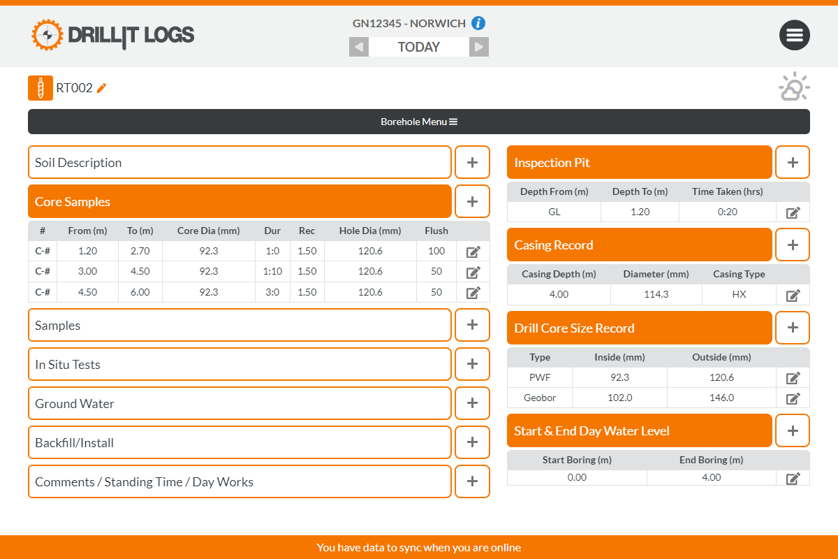 Simplify the creation of your Daily Rotary Drilling Records with Drillit Logs, making on-site data entry quick and effortless. Easily input detailed soil descriptions with a simple click, and add photos as necessary. Accurately log core samples, routine sampling, and test results by depth, with automatic label generation to ensure precise documentation. Key data such as groundwater levels, trial pit details, chiselling, and casing records are all efficiently captured to compile the final log.